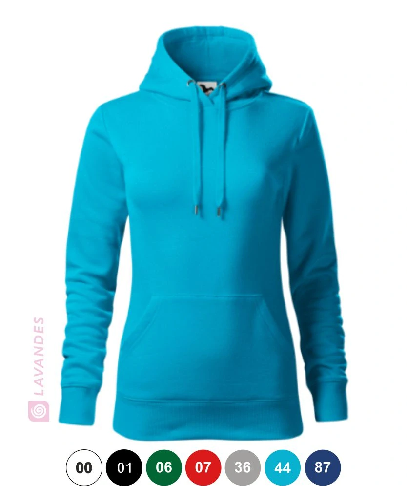 Dámská mikina Cape klasického střihu, s kapucí s podšívkou a šňůrkou na stažení.